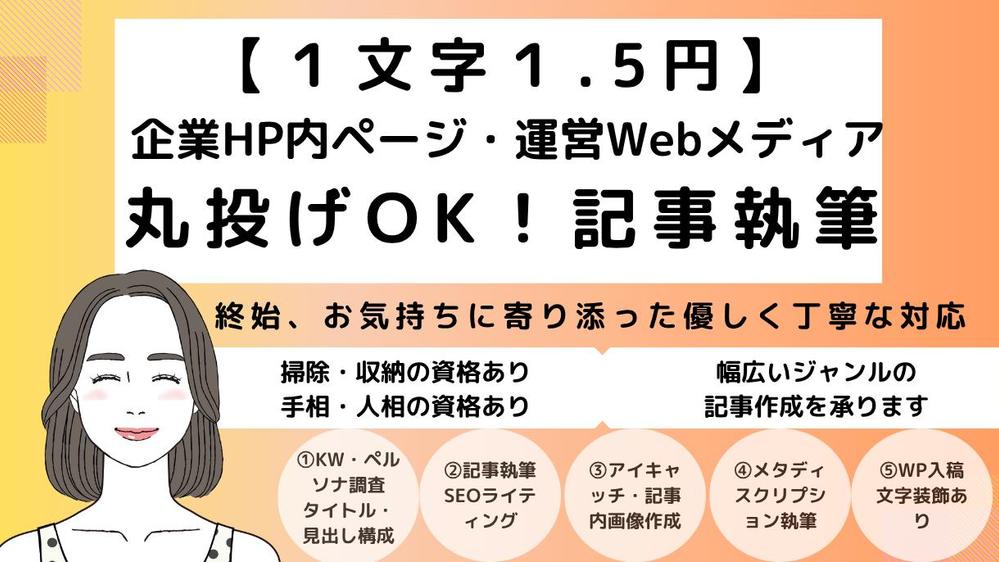 運営されているサイトや執筆記事のペルソナや検索KW(キーワード)を常に意識し、必要な方へ必要な情報が届くよう意識して執筆いたします。。