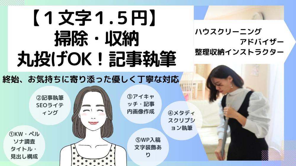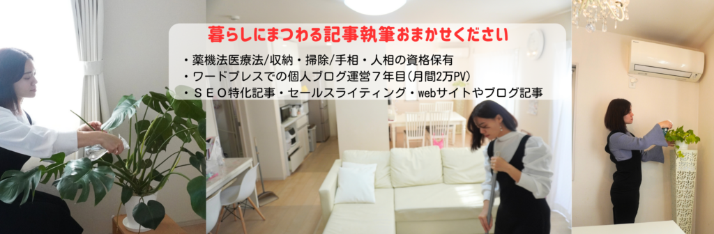 家の中のあらゆる箇所の掃除方法や必要な道具・洗剤の話など専門的な知識を用いた記事執筆が可能です。